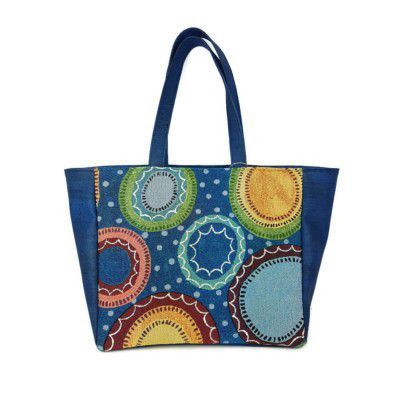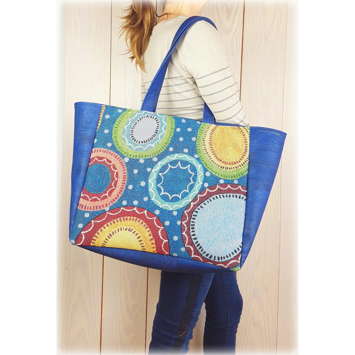 Le BigBeach est un grand sac cabas, avec un très beau tissu Jacquard et liège bleu jeans.