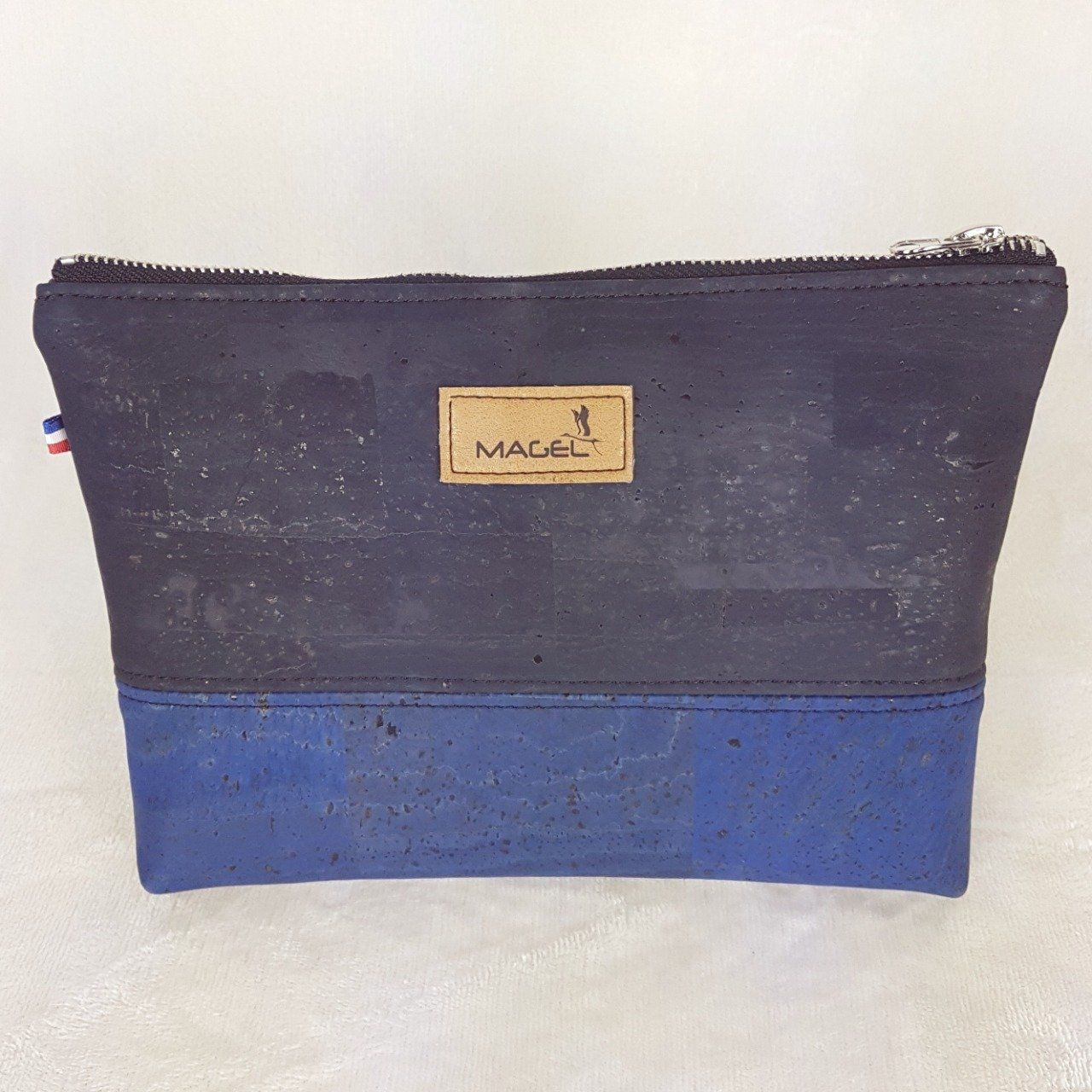 Pochette Lana en liège bleu jean et bleu marine.