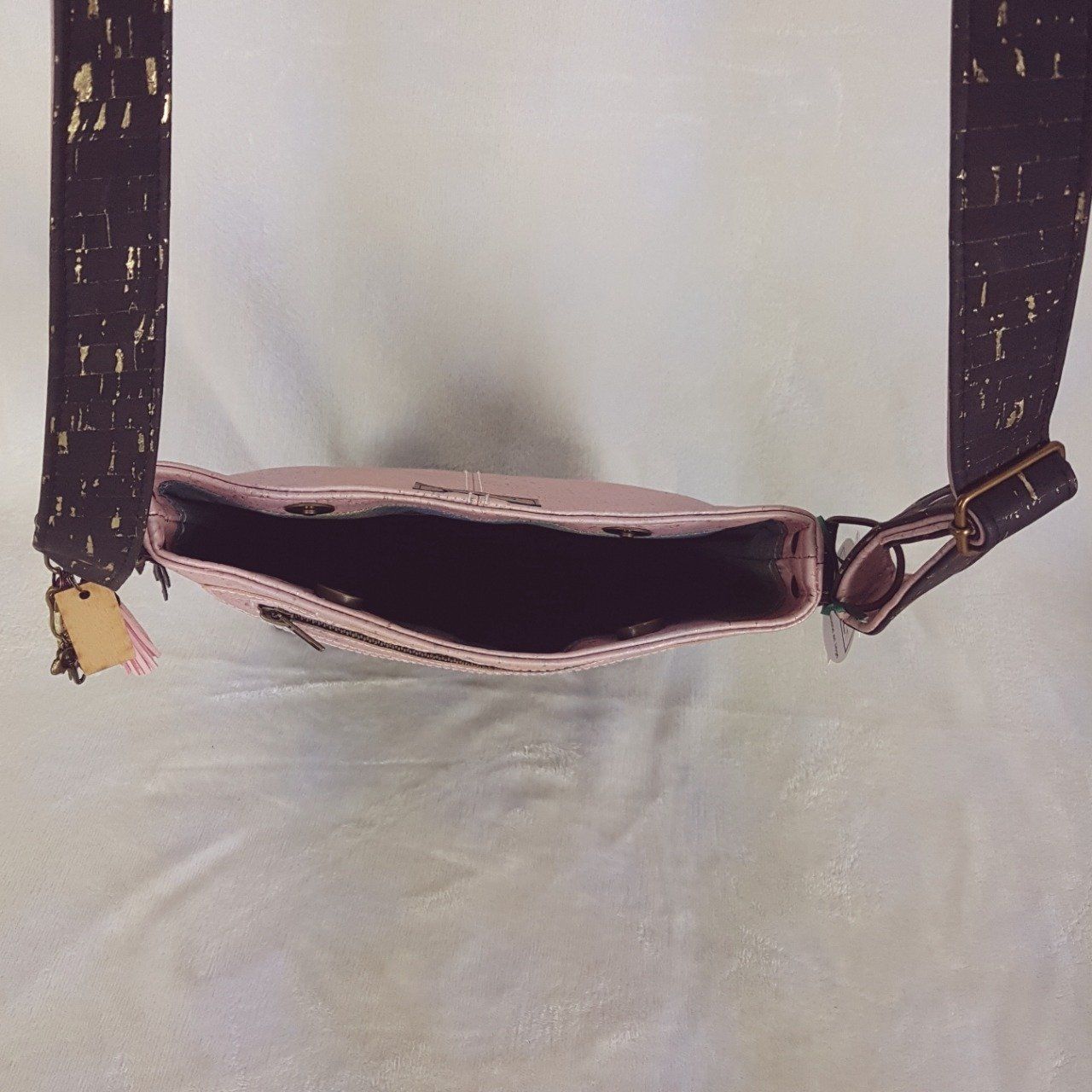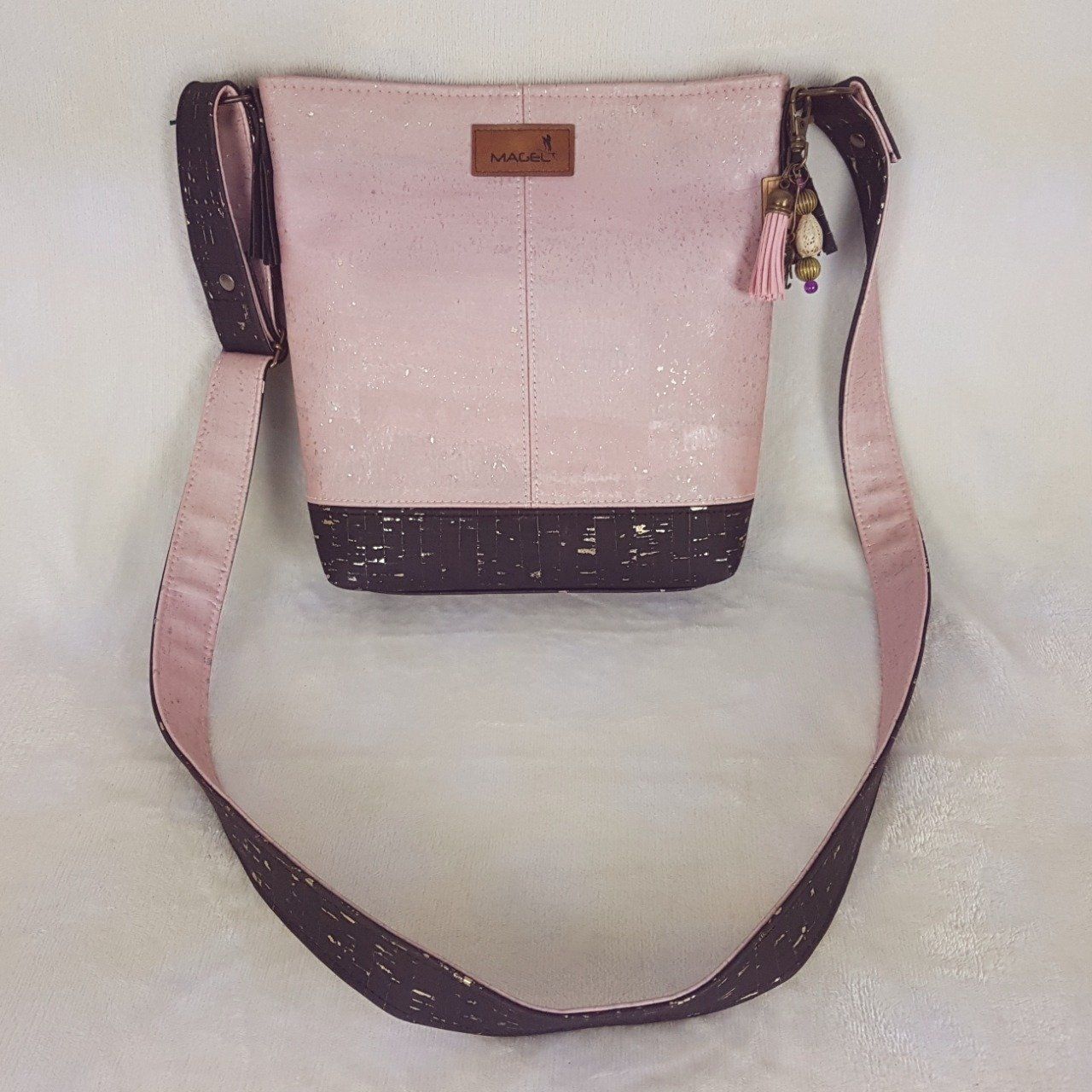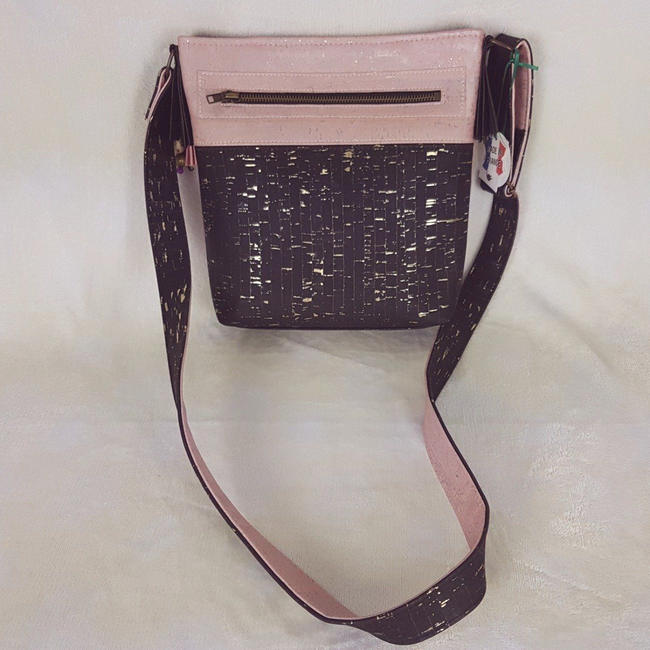 Sac à bandoulière Lina en liège noir et rose à reflet dorés.